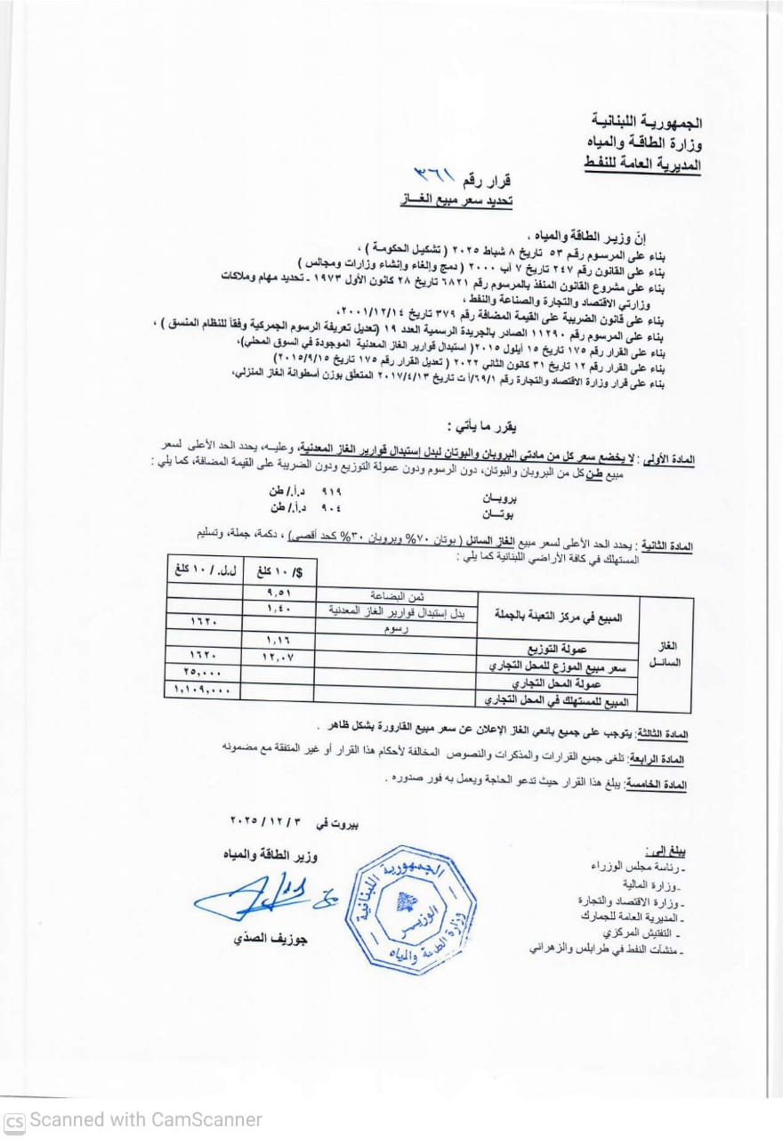 صدر عن وزارة الطاقة والمياه جدول جديد للمحروقات، وجاءت الاسعار على الشكل الآتي: