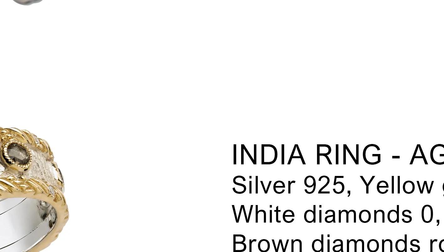 India Ring: خاتم راقٍ من الفضّة والذهب الأصفر، مزدان بألماس أبيض (0.15 قيراط) وألماس بنّي مقطوع بأسلوب الوردة (0.45 قيراط)، يعكس دفئاً وأناقة فريدة.