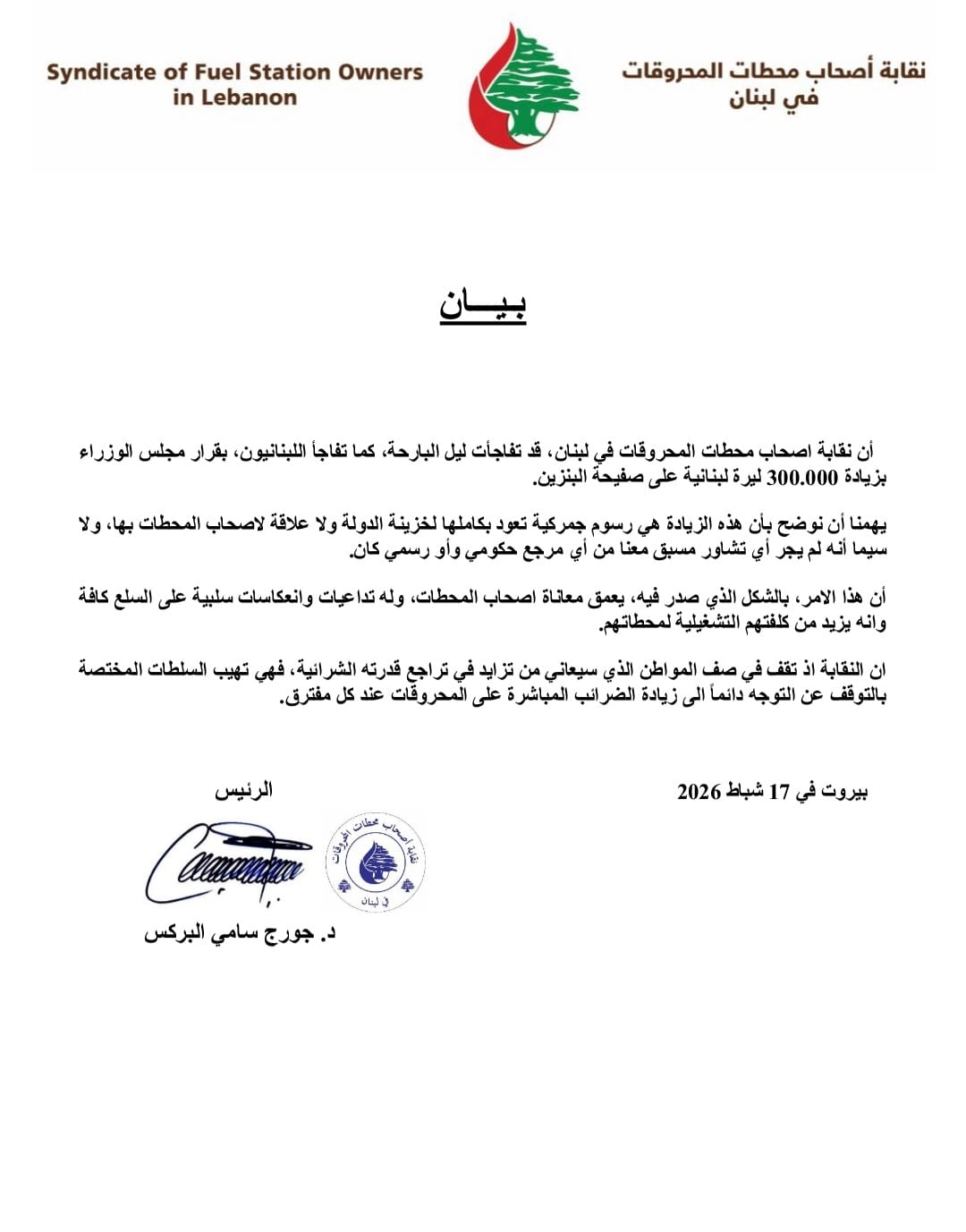 أعلن نقيب أصحاب محطات المحروقات جورج البراكس في بيان، أن النقابة "تفاجأت ليل البارحة، كما تفاجأ اللبنانيون، بقرار مجلس الوزراء بزيادة 300.000 ليرة لبنانية على صفيحة البنزين".