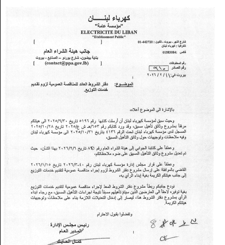 وفيما علمت "النهار" أن دفتر الشروط أصبح في هيئة الشراء العام وهو قيد التدقيق، يبدو أن (الدفتر) استند إلى صيغة أعدت عام 2010، مع حذف بنود كانت تمنح الشركات قدرا من الاستقلالية، وفي مقدمها موقع مدير البرنامج المستقل الذي كان يعوض جزئيا غياب الهيئة الناظمة. كذلك جرى تقييد صلاحيات الشركات التنفيذية بحيث أصبحت قراراتها خاضعة لموافقة رئيس الدائرة في مؤسسة الكهرباء. والسؤال: إذا كانت الوزارة تحترم دور الهيئة الناظمة، فلمَ تمنح المسودة الجديدة صلاحية القرار النهائي لـرئيس الدائرة بدلا من ربط العقود بمرجعية الهيئة كما يطلب القانون 462 والبنك الدولي؟".