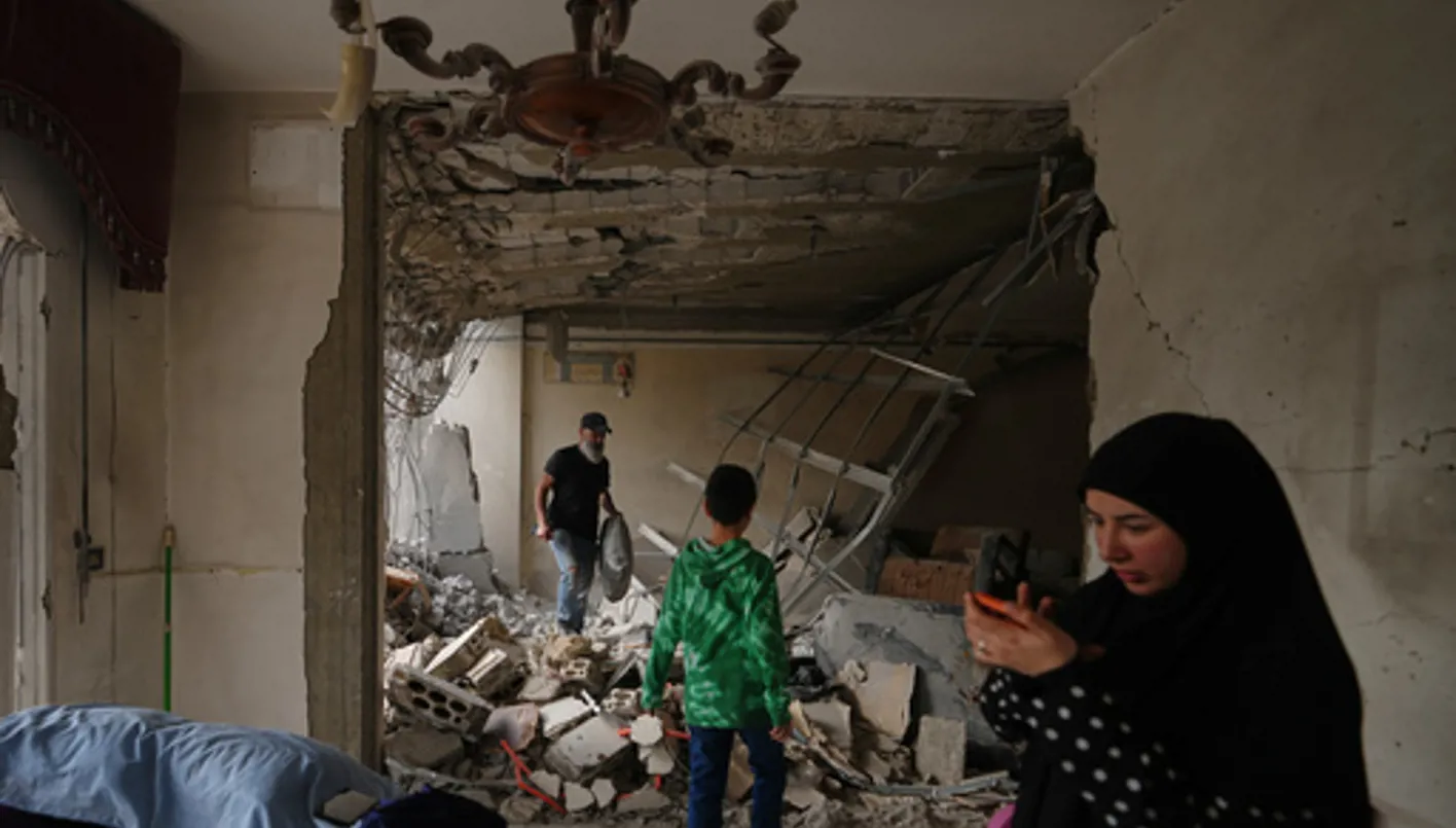 Fadi Al Zein, left, who lost both his homes in Israeli strikes in his village of Khiam and in Dahiyeh, searches through the rubble of his heavily damaged home as a child stands nearby, in Beirut's southern suburbs, Lebanon, Saturday, April 25, 2026. (AP Photo/Hassan Ammar)