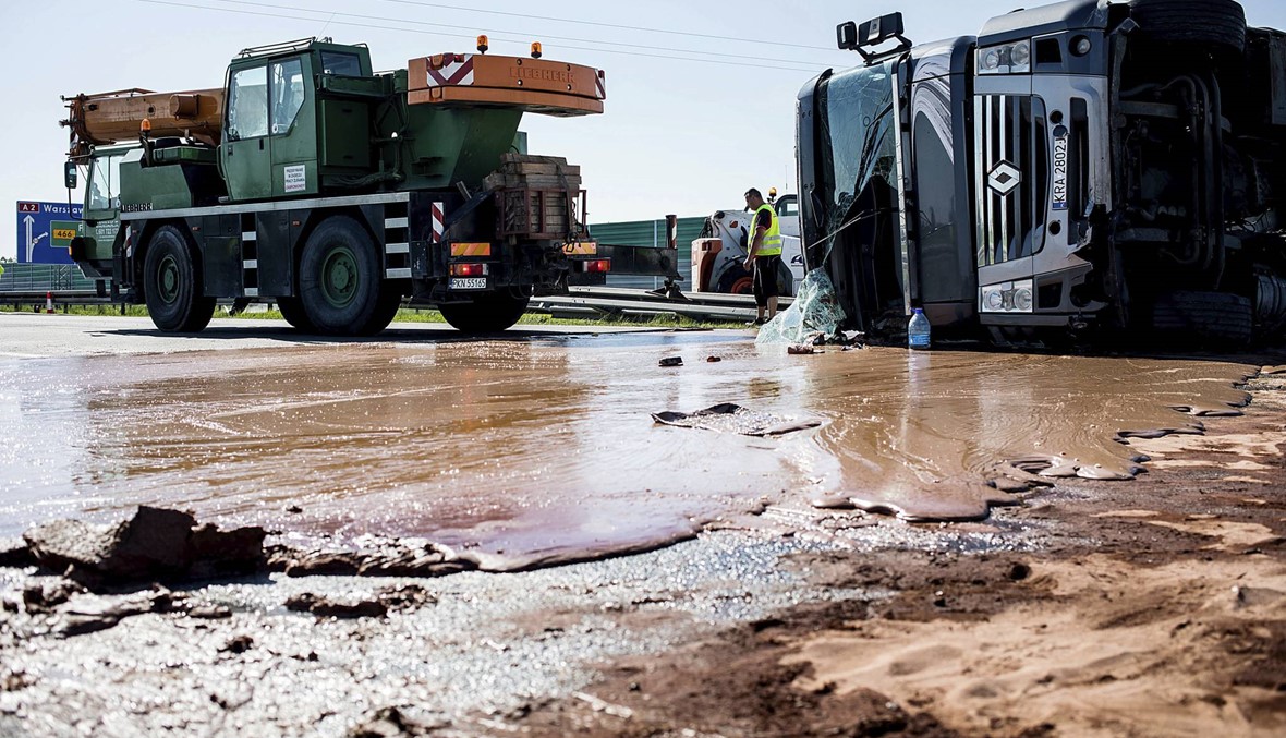 The private broadcaster TVN24 showed images of an overturned truck surrounded by brown chocolate covering six lanes on the A2 motorway, blocking traffic in both directions.