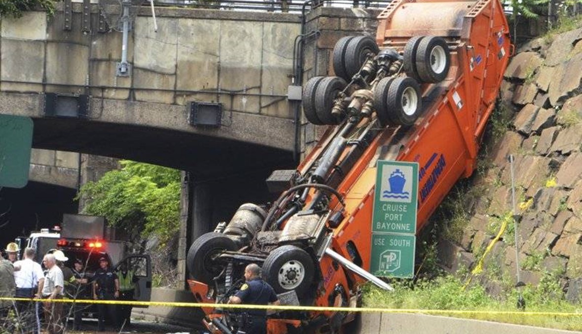 UNION CITY, N.J.: A garbage truck flipped over a stone wall outside one of two tunnels connecting New Jersey with New York Wednesday, injuring several people including one critically.