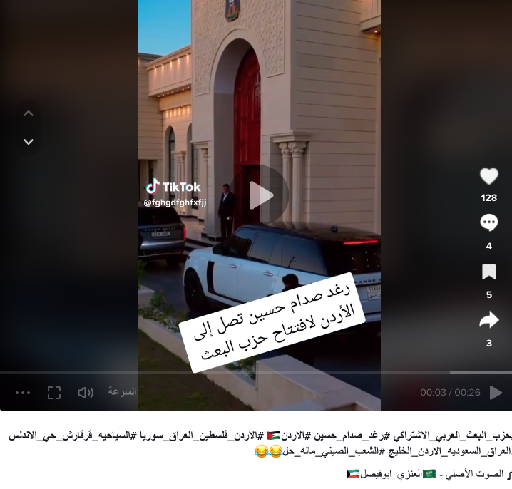 الوقائع: مدة الفيديو 0:26 ثانية، ويظهر وصول سيارات فخمة إلى قصر ترجل منها شاب وسيدة، قبل ان يدخلا المكان، ملقيين التحية على مستقبليهما. وقد تكثف التشارك في الفيديو مؤخراً، عبر مواقع التواصل الاجتماعي، مرفقاً بالمزاعم الآتية (من دون تدخل أو تصحيح): "وصول رغد صدام حسين في الاردن لافتتاح مكتب حزب البعث".