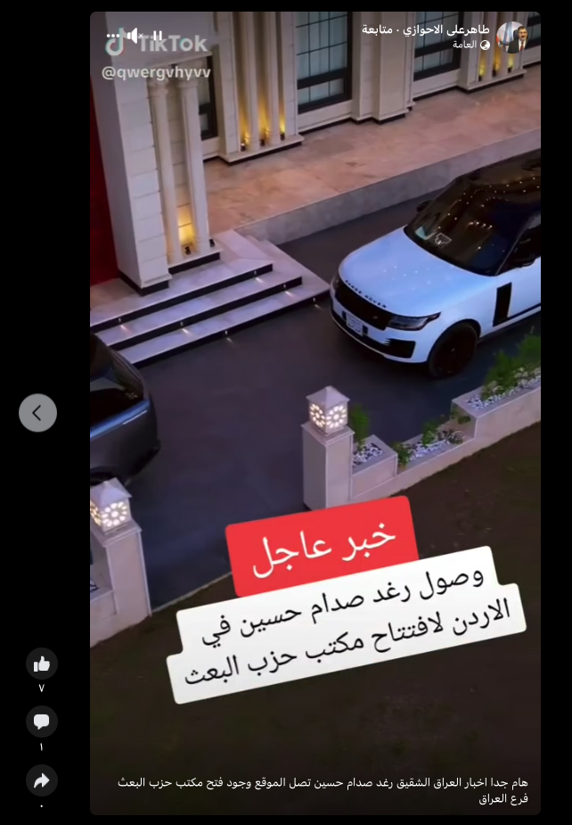 يتناقل مستخدمون لوسائل التواصل الاجتماعي فيديو بمزاعم أن "رغد صدام حسين وصلت إلى مقر حزب البعث في الأردن لافتتاحه بعد منحه ترخيصا بالعمل السياسي". غير أنّ هذا الزعم غير صحيح، والفيديو المتناقل له سياق مختلف تماماً. #FactCheck