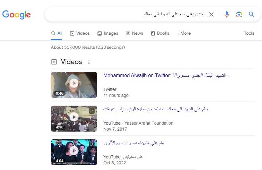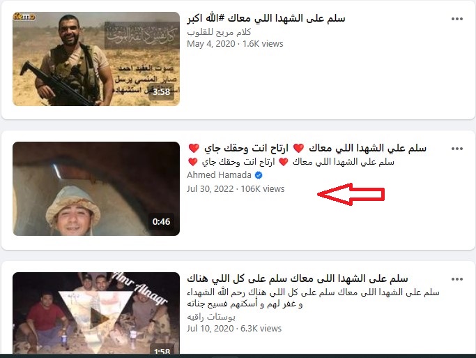 ثم جاءت المرحلة الثالثة عبر البحث تقليدياً في موقع التواصل الاجتماعي الأشهر استخداماً في مصر "فايسبوك" عبر جملة: "سلم على الشهدا اللي معاك"، وجاءت المفارقة أن الفيديو يعود إلى 30 حزيران (يوليو) 2022، لصفحة باسم أحمد حماده.