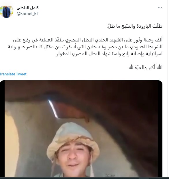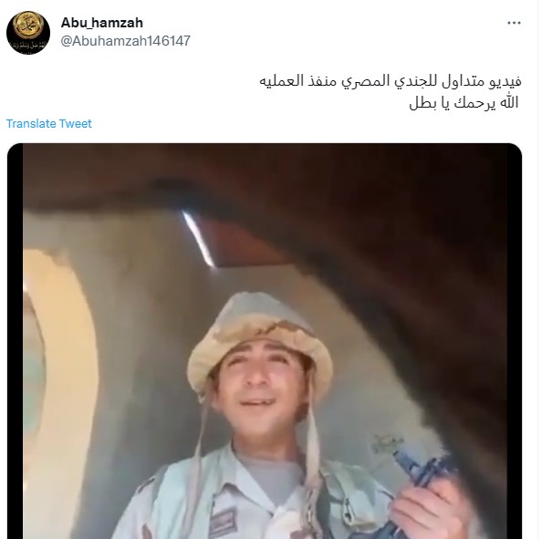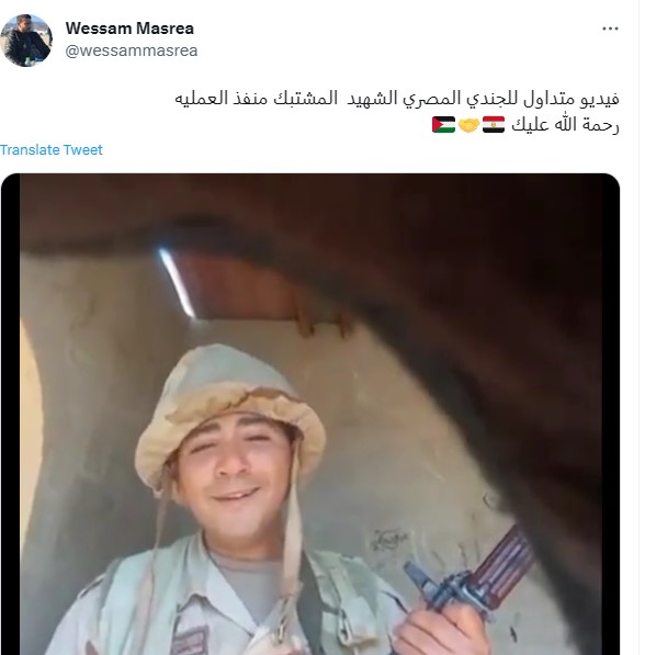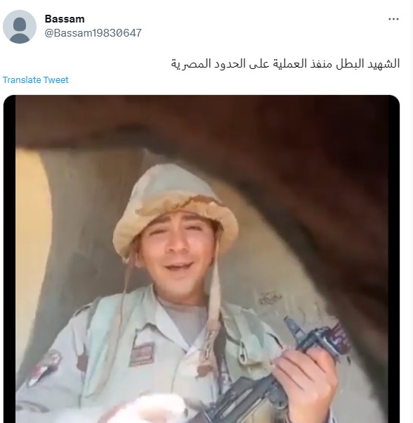 وكتب حساب آخر تعليقاً (من دون تدخل) جاء فيه: "فيديو متداول للجندي المصري الشهيد المشتبك منفذ العملية".