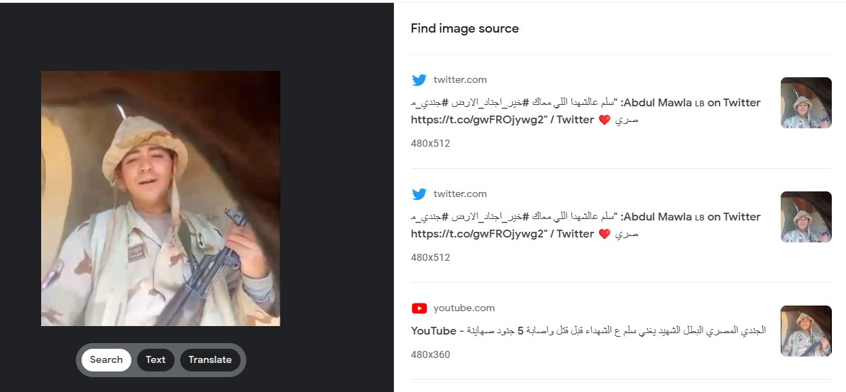 وباستخدام هذه الصور للبحث عنها في محرك lens.google، جاءت النتيجة لمقطع الفيديو المرفق به التعليقات التي تزعم أنها للجندي الذي استشهد على الحدود.
