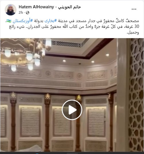 فقد نشر حساب يتابعه ما يزيد عن 320 ألف متابع على موقع "فايسبوك"، مقطع فيديو لأحد المساجد محفور على جدرانه المصحف الشريف، وكتب (من دون تدخل): "مصحفٌ كاملٌ محفورٌ في جدار مسجد في مدينة بخارى بدولة أوزبكستان".