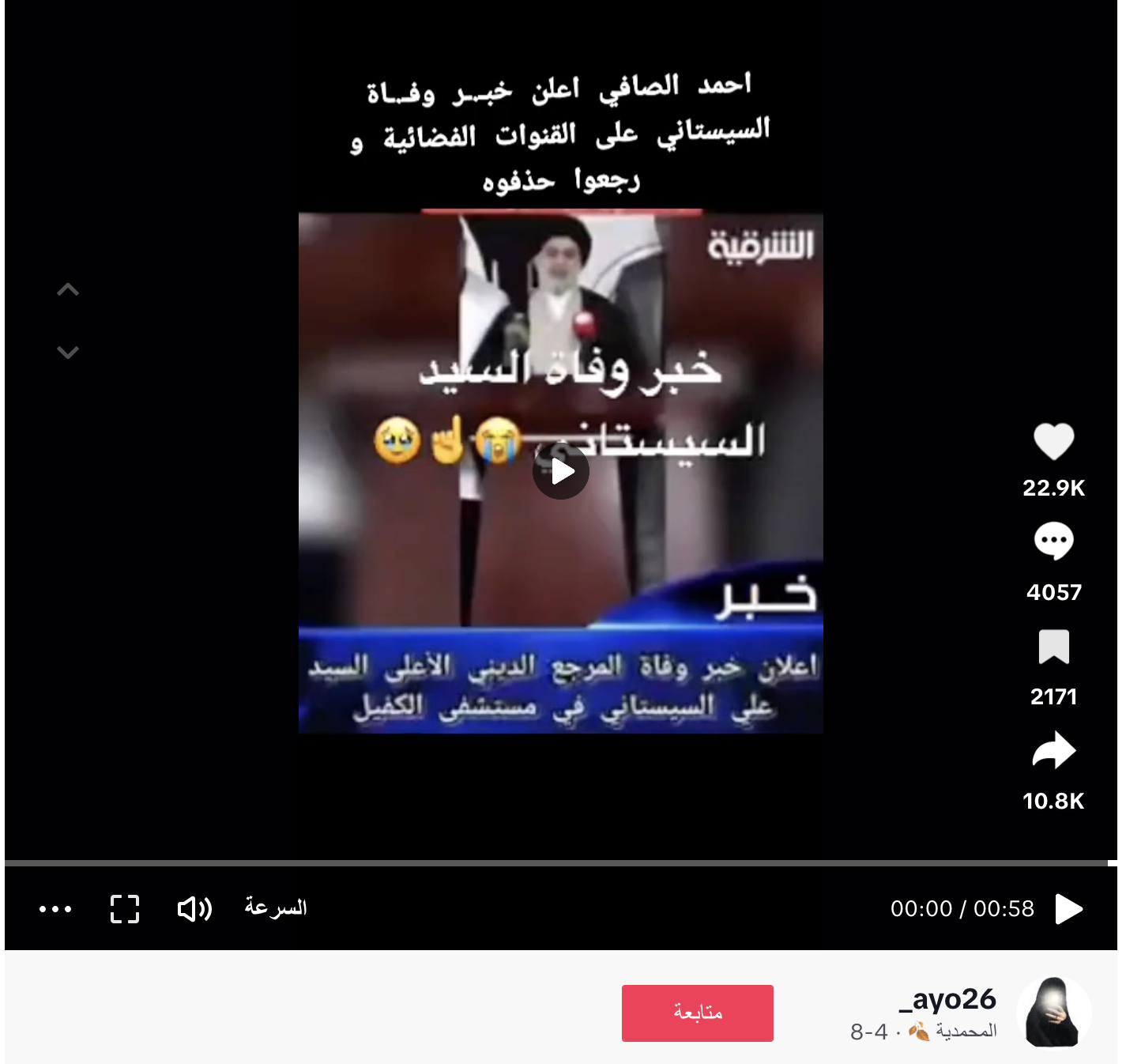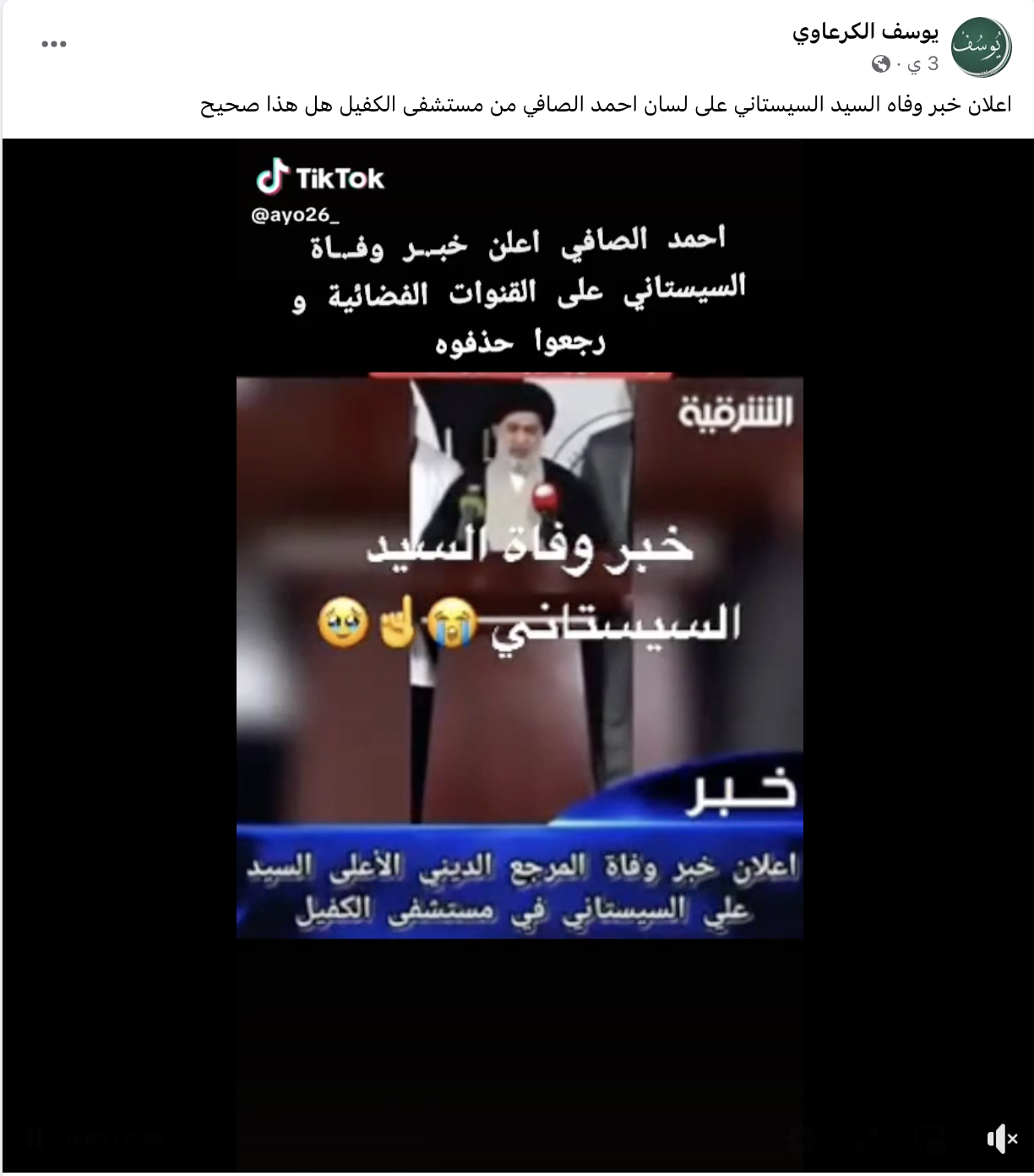 الوقائع: 58:0 ثانية مدة الفيديو، ويظهر ممثل المرجع الديني يتحدث وراء منصة عن المرجع الديني علي السيستاني، ثم يبكي. وقد تكثف التشارك فيه مؤخراً في مواقع التواصل الاجتماعي، مرفقا بالمزاعم الآتية (من دون تدخل أو تصحيح): "اعلان خبر وفاه السيد السيستاني على لسان احمد الصافي من مستشفى الكفيل هل هذا صحيح".
