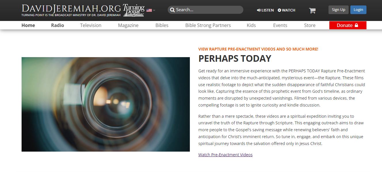 كذلك، يسوّق موقع القس جيريميا (هنا) هذه الفيديوات الدرامية المسبقة للاختطاف (Rapture Pre-Enactment videos)، و"التي تتعمق في الحدث الغامض المرتقب"، على قوله. ويشير الى ان "هذه اللقطات تم تصويرها بواسطة أجهزة مختلفة، وتهدف الى إثارة الفضول والمناقشة".