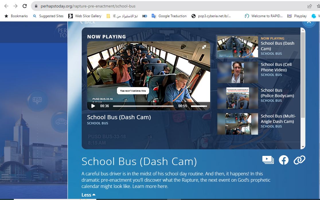 وقد ارفقته الحملة بشرح انه يظهر "سائق حافلة حذرا في خضم روتين يومه المدرسي. وبعد ذلك، يحصل الامر. في هذا العمل الدرامي المسبق، ستكتشفون كيف قد يبدو الاختطاف Rapture، الحدث المقبل في التقويم النبوي لله".