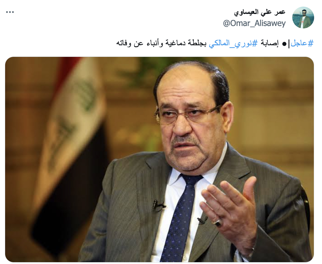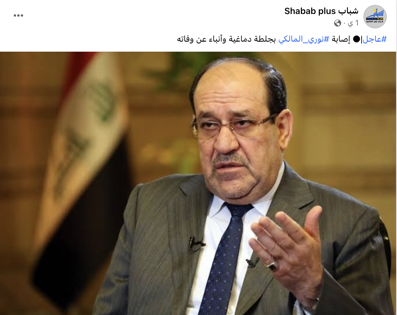 الوقائع: تكثف التشارك في الخبر أخيرا في مواقع التواصل الاجتماعي. وجاء فيه (من دون تدخل أو تصحيح): "عاجل- إصابة نوري المالكي بجلطة دماغية وأنباء عن وفاته".