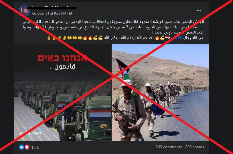 أعلن رئيس الهيئة الإعلامية لجماعة الحوثيين في اليمن نصر الدين عامر في حديث لوكالة فرانس برس في الأول من تشرين الثاني أن جماعته مستعدّة "لإرسال مقاتلين (إلى غزّة) لكن هناك مشكلة جغرافية في البعد عن فلسطين". في هذا السياق، انتشرت صورة ادعى ناشروها أنها لمقاتلين يمنيين متّجهين بالفعل إلى هناك. إلا أن الادعاء غير صحيح، فالصورة ملتقطة من مسيرة تضامنيّة مع الفلسطينيين في محافظة الجوف في شمال شرق صنعاء.