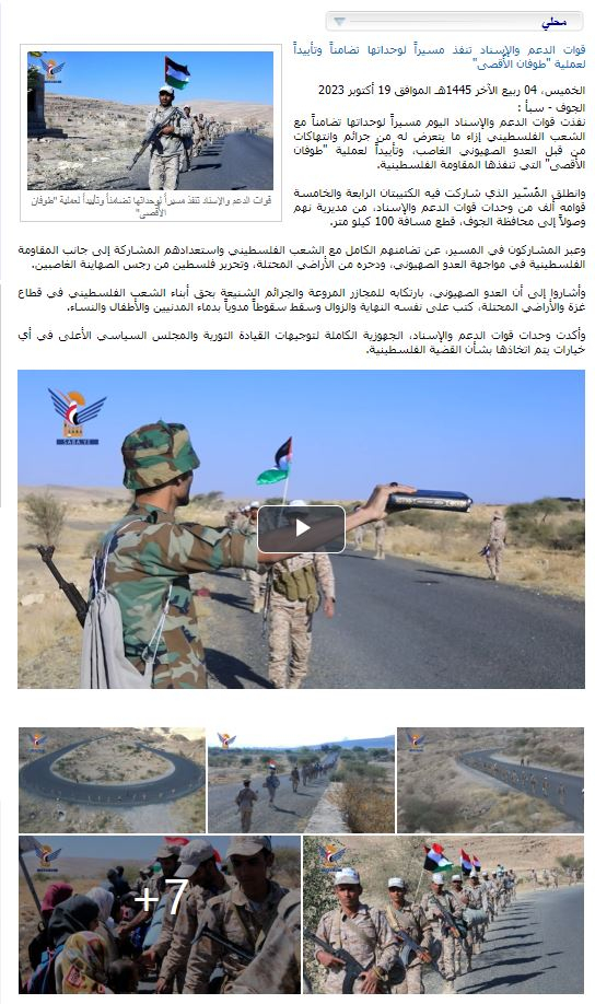 فقد أظهر التفتيش عنها عبر محركات البحث أنها منشورة على موقع وكالة سبأ اليمنية التابعة للحوثيين في 19 تشرين الأول 2023 على أنها مسيرة لمقاتلين يمنيين في محافظة الجوف تضامناً وتأييداً لعملية "طوفان الأٌقصى".