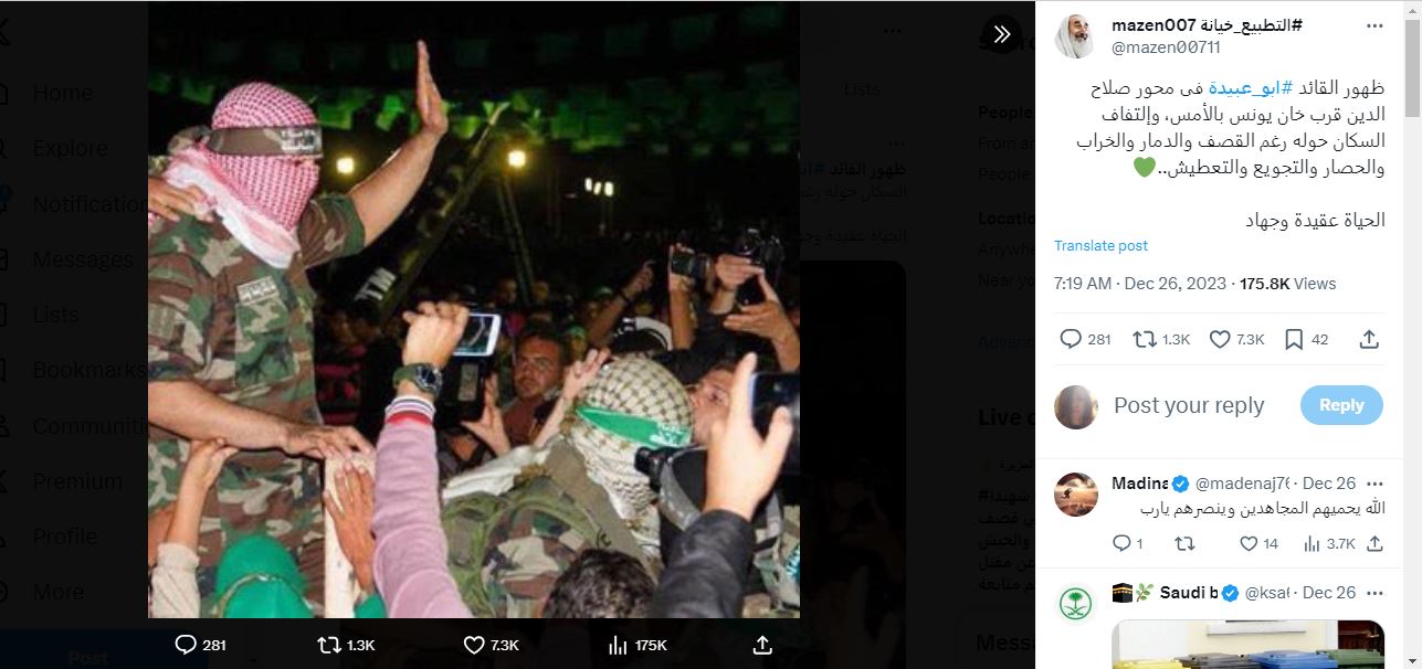 الصورة تظهر شخصاً لف وجهه بكوفية فلسطينية بينما كان يحيي جمعاً، بينما بيّن الفيديو أبو عبيدة متكلما عن عملية ما. وقد تكثف التشارك فيهما أخيرا عبر مواقع وحسابات، عربية وأجنبية، ارفقت الصورة بالمزاعم الآتية: "ظهور القائد ابو عبيدة فى محور صلاح الدين قرب خان يونس بالأمس، والتفاف السكان حوله رغم القصف والدمار والخراب والحصار والتجويع والتعطيش". وكتب مع الفيديو: "أبو عبيدة يظهر في 24 كانون الاول 2023 خلال خوضه معركة مع الاحتلال الاسرائيلي".