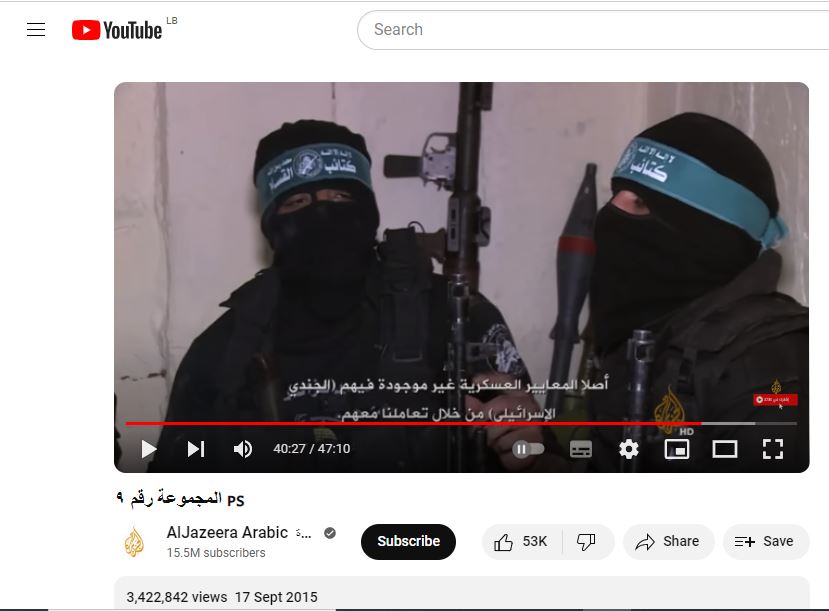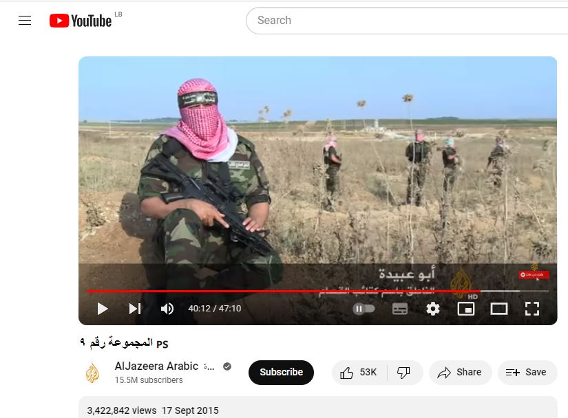 كذلك، يوصلنا البحث عن الفيديو، بتجزئته الى مشاهد ثابتة (Invid)، وباستخدام كلمات مفاتيح، الى خيوط (مثل هنا، هنا) تقودنا الى مصدره الاصلي، قناة "الجزيرة"، التي نشرت هذه المشاهد ضمن تقرير أطول بعنوان: "المجموعة رقم 9"، في 17 ايلول 2015 (هنا). ويمكن مشاهدة المقطع المتناقل ابتداء من التوقيت 40:12.