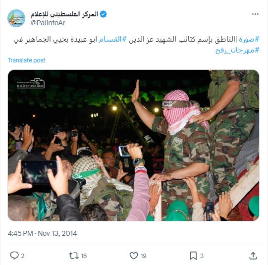 فالبحث العكسي عن الصورة يقودنا الى خيوط (هنا) توصلنا اليها منشورة في حساب المركز الفلسطيني للاعلام في اكس في 13 تشرين الثاني 2014 (هنا) مرفقة بالشرح الآتي: "الناطق بإسم كتائب الشهيد عز الدين القسام ابو عبيدة بحيي الجماهير في مهرجان رفح".