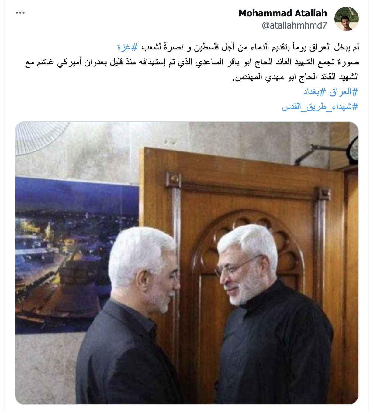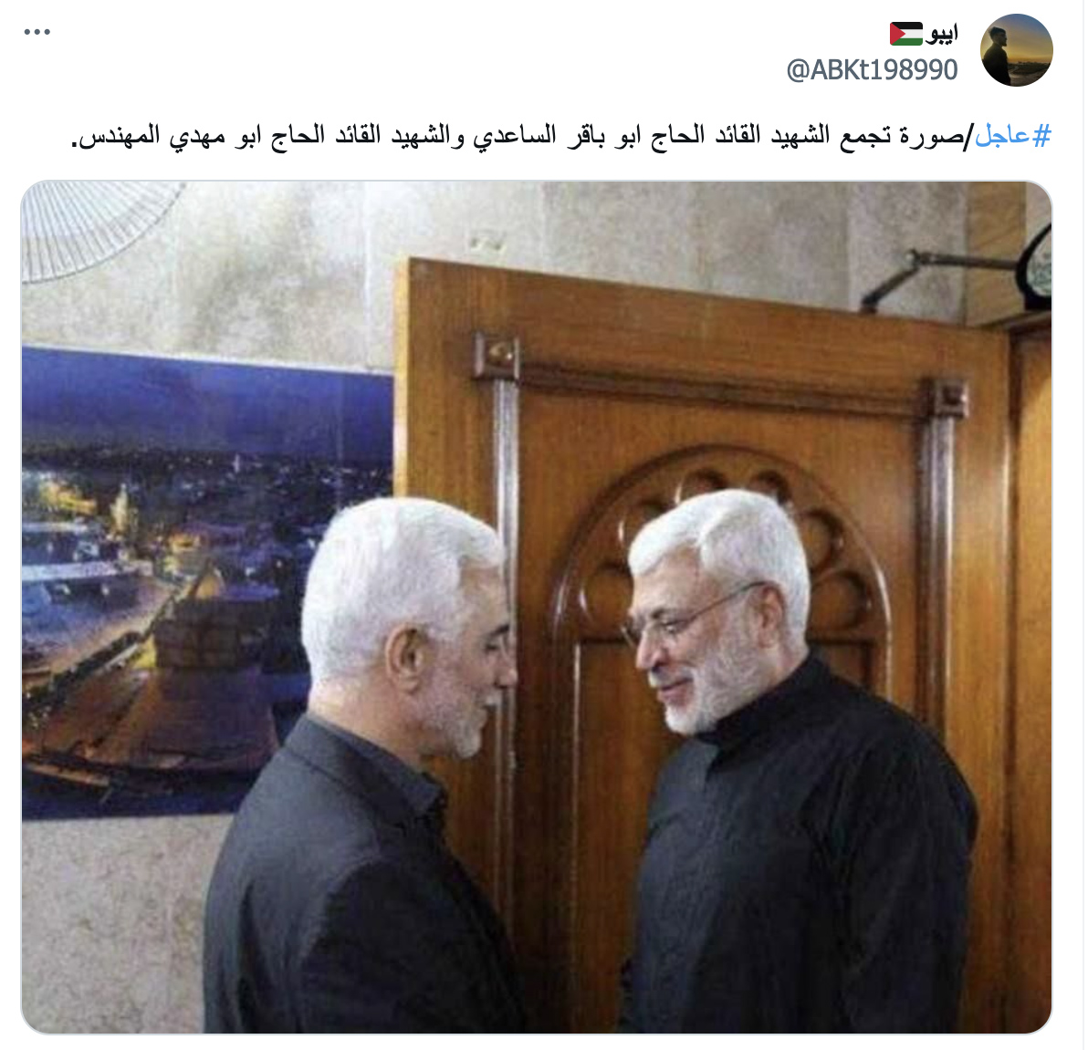 يتداول مستخدمون لمواقع التواصل الاجتماعي ووسائل إعلام عربية صورة بمزاعم أنها "تجمع وسام محمد صابر الساعدي الملقب ابو باقر الساعدي، القيادي في حزب الله العراقي، والذي قتل في قصف من مسيرة أميركية استهدفت سيارته في بغداد قبل يومين، وأبو مهدي المهندس". غير أنّ هذا الزعم غير صحيح، والصورة لها سياق مختلف.  #FactCheck