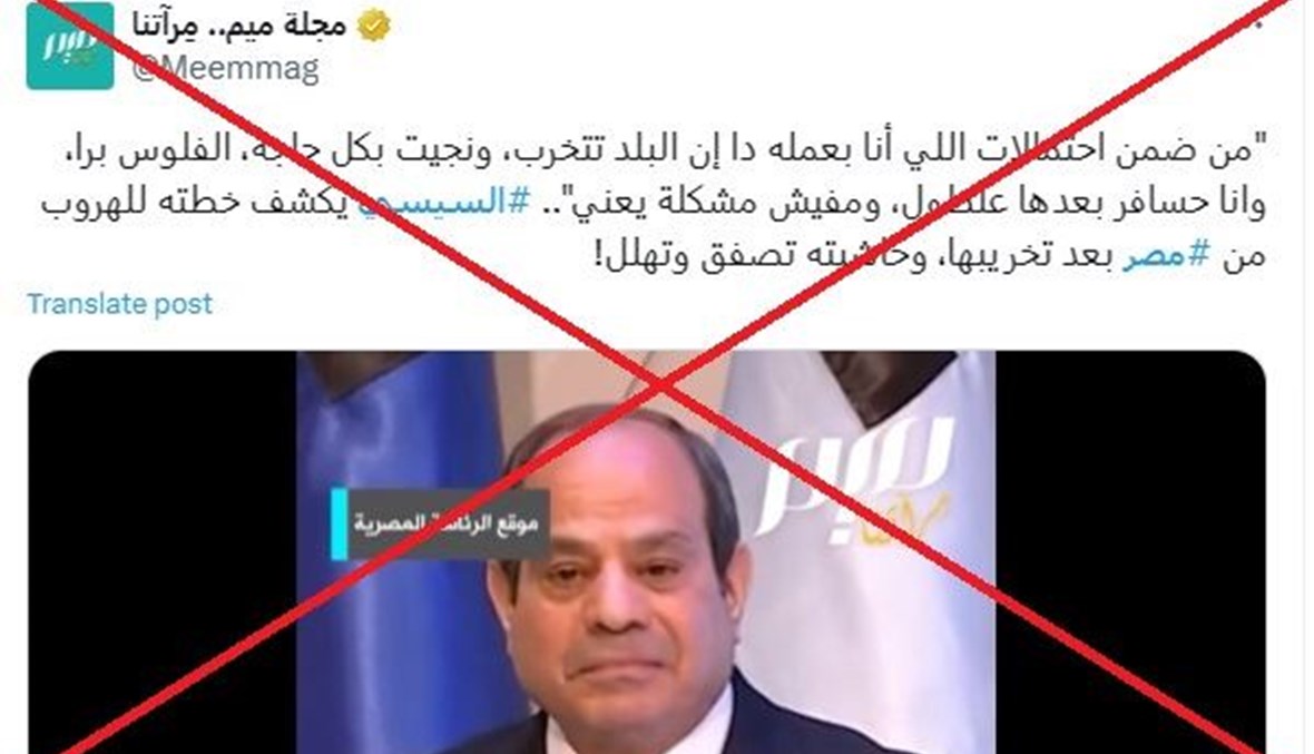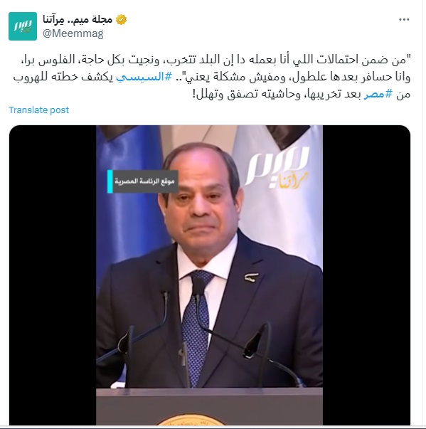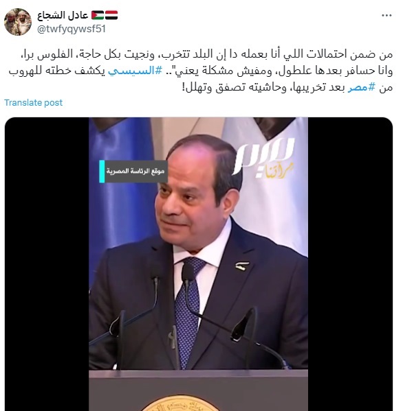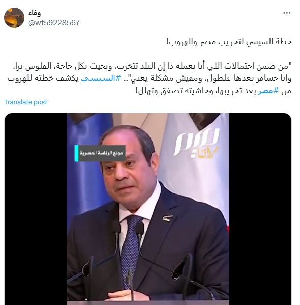 فقد نشرت حسابات على موقع X مقطع فيديو لكلمة متلفزة للرئيس السيسي وكتبت (من دون تدخل): "من ضمن احتمالات اللي أنا بعمله دا إن البلد تتخرب، ونجيت بكل حاجة، الفلوس برا، وانا حسافر بعدها علطول، ومفيش مشكلة يعني".. السيسي يكشف خطته للهروب من مصر بعد تخريبها، وحاشيته تصفق وتهلل.
