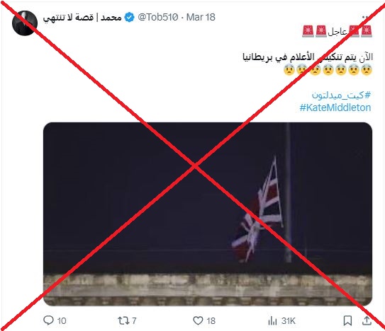 في وقت طغت الشائعات حول أميرة ويلز كيت ميدلتون على الأحداث في العالم، انتشر في الساعات الماضية خبر عن "وفاة ملك بريطانيا تشارلز الثالث"، ارفق بصورة لبيان منسوب إلى قصر باكنغهام بهذا الشأن، اضافة الى صورة تظهر "علما منكسا في بريطانيا"، وفقا للادعاءات. الا أنّ الملك تشارلز لم يمت، والبيان المنسوب الى قصر باكنغهام زائف، وصورة العلم المنكس قديمة ولها سياق مختلف. FactCheck#