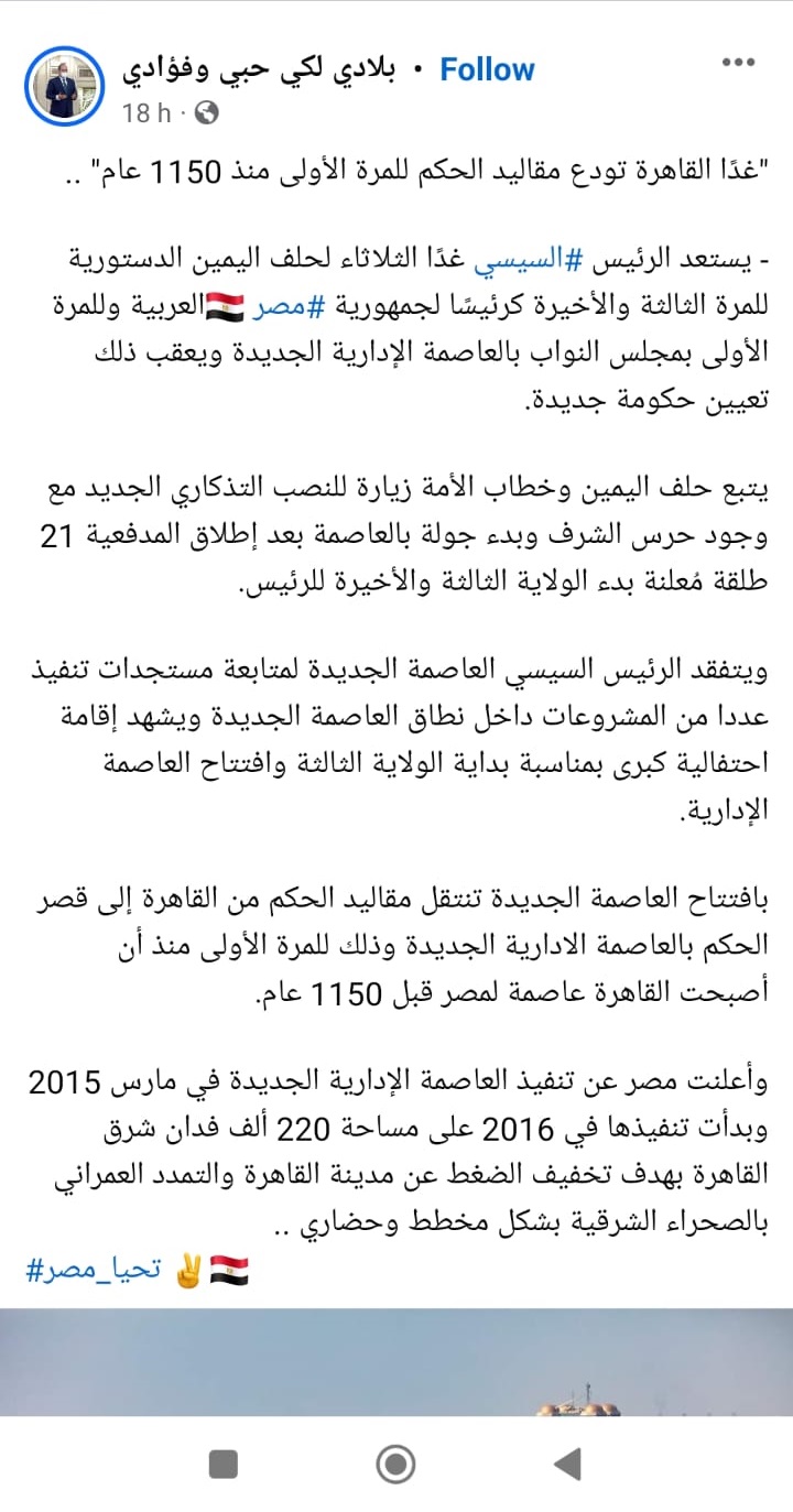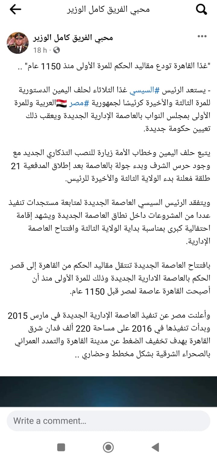 وتابع المنشور: بافتتاح العاصمة الجديدة تنتقل مقاليد الحكم من القاهرة إلى قصر الحكم بالعاصمة الادارية الجديدة وذلك للمرة الأولى منذ أن أصبحت القاهرة عاصمة لمصر قبل 1150 عام.