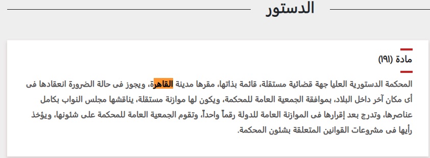 - تضمن الدستور المصري، في المادة رقم (191)، استمرار وجود رمز السلطة القضائية في البلاد، وهي المحكمة الدستورية العليا، في مقرها بمدينة القاهرة. وقال إنه "يجوز في حال الضرورة انعقادها في أي مكان آخر داخل البلاد، بموافقة الجمعية العامة للمحكمة، وتكون لها موازنة مستقلة يناقشها مجلس النواب بكامل عناصرها، وتدرج بعد إقرارها في الموازنة العامة للدولة رقماً واحداً. وتقوم الجمعية العامة للمحكمة على شؤونها، ويؤخذ رأيها في مشروعات القوانين المتعلقة بشؤون المحكمة".