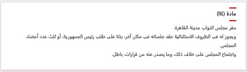 - تضمن الدستور أيضاً في المادة (114) نصا يؤكد ضرورة أن يكون مقر "مجلس النواب مدينة القاهرة. ويجوز له في الظروف الاستثنائية عقد جلساته في مكان آخر، بناءً على طلب رئيس الجمهورية، أو ثلث عدد أعضاء المجلس. واجتماع المجلس على خلاف ذلك، وما يصدر عنه من قرارات، باطل".