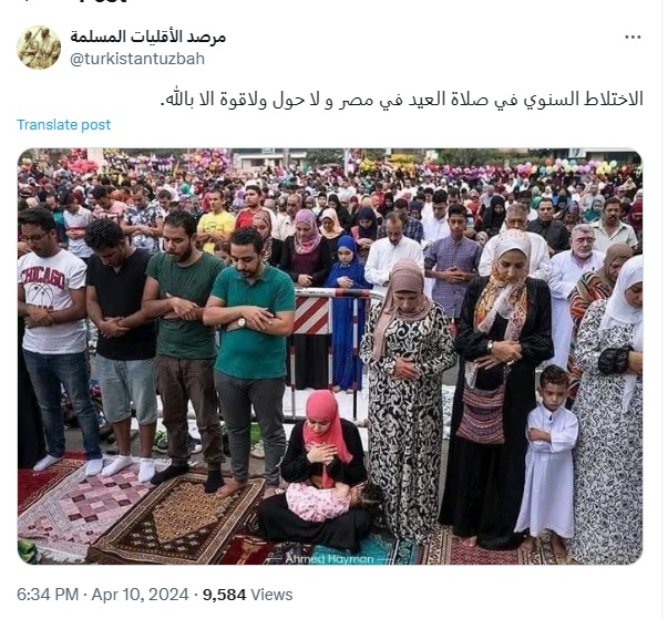 فقد نشر حساب على "إكس"، صورة توضح الاختلاط في صلاة عيد الفطر بين النساء والرجال في مصر وكتب عليها تعليق (من دون تدخل): "الاختلاط السنوي في صلاة العيد في مصر ولا حول ولا قوة الا بالله.".