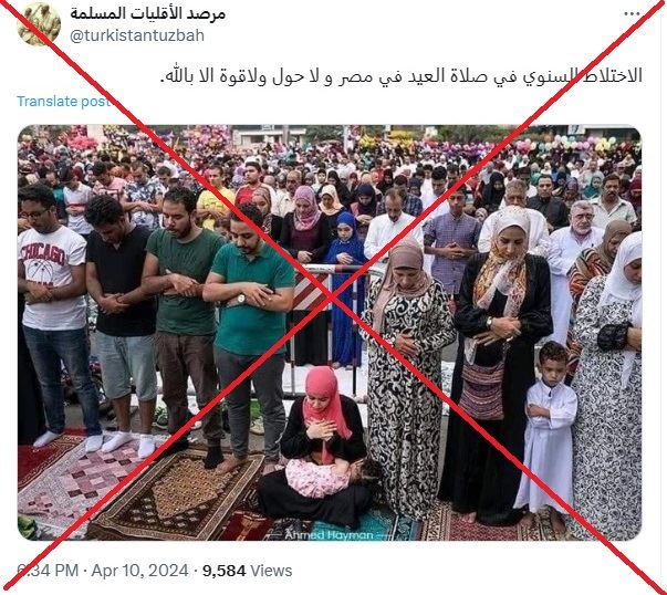 نشر حساب على موقع التدوينات القصيرة "إكس" (تويتر سابقاً)، صورة زعم أنها للاختلاط بين النساء والرجال خلال صلاة عيد الفطر في مصر؛ وهي ملفقة تماماً. FactCheck#