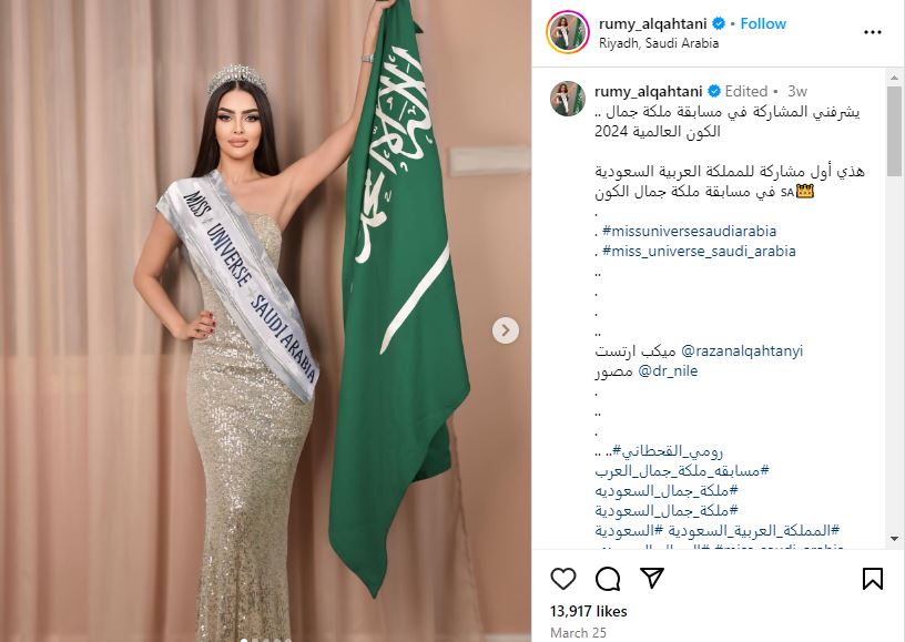 وكانت القحطاني فاجأت الجميع بمنشور في حسابها في انستغرام، في 25 آذار 2024 (هنا)، قالت فيه انه "يشرفني المشاركة في مسابقة ملكة جمال الكون العالمية 2024. وهذه أول مشاركة للمملكة العربية السعودية في مسابقة ملكة جمال الكون".