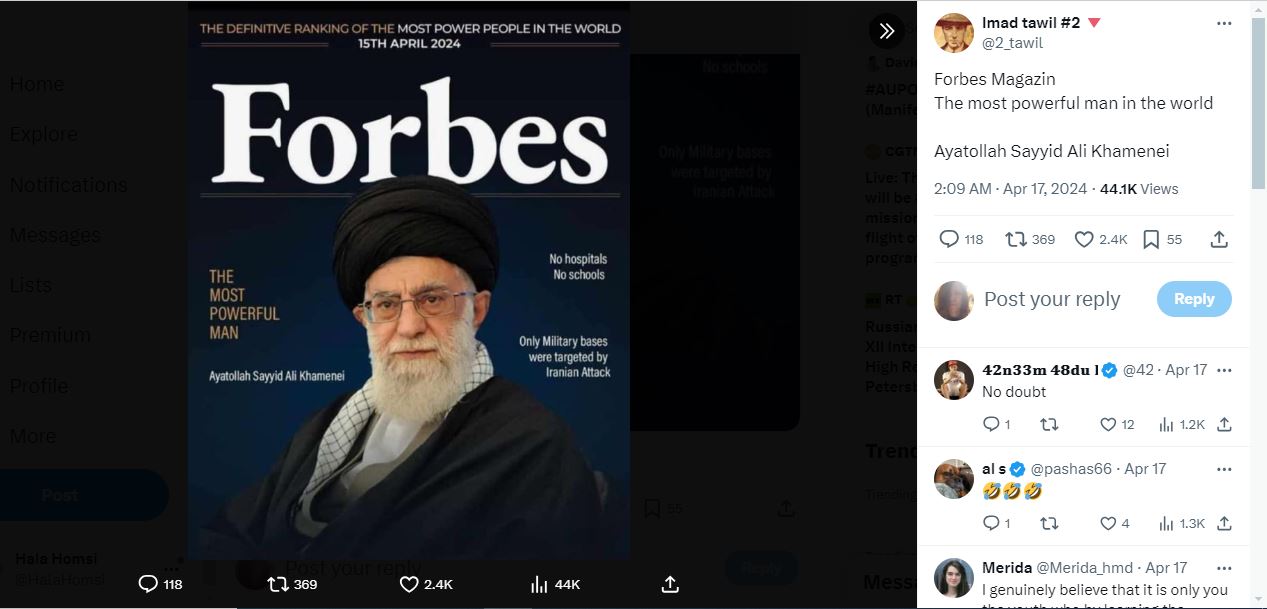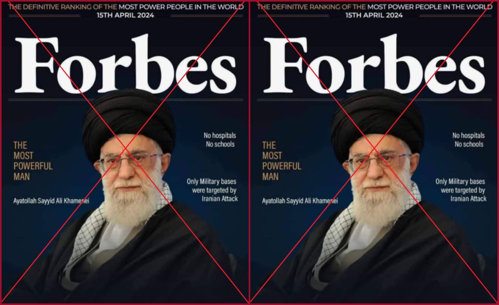 النتيجة: اذاً، لا صحة للمزاعم ان "المرشد الأعلى للجمهورية الاسلامية الايرانية آية الله علي خامنئي ظهر على غلاف لمجلة "فوربس" الأميركية مؤرخ في 15 نيسان 2024 مع تعليق أنه أقوى رجل". في الحقيقة الصورة زائفة، ولم تنشر مجلة "فوربس" غلافا مماثلا.