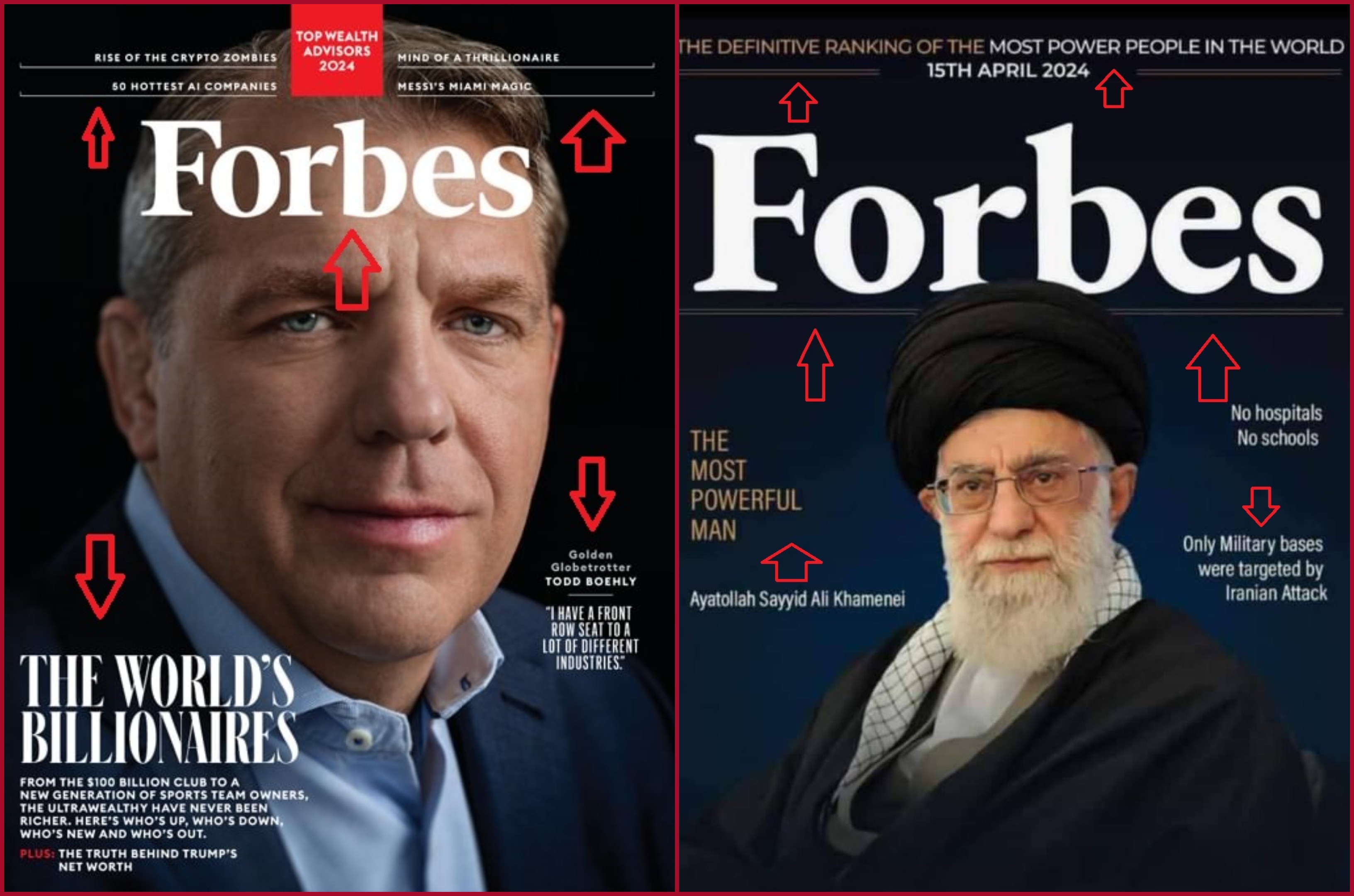 التركيز على تاريخ 15 نيسان 2024 يوصلنا (هنا) الى غلافات يومية نشرتها مجلة "فوربس" في ذلك اليوم (هنا، هنا، هنا...)، واحداها تضمنت قائمتها لريادة الأعمال CMO لعام 2024 (هنا). ولا اثر مجدداً لخامنئي ولا ذكر لترتيب لأقوى الأشخاص في العالم.