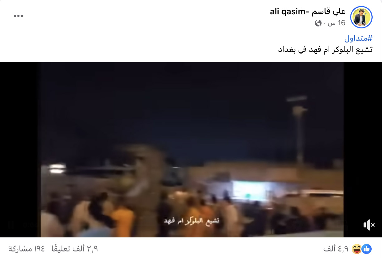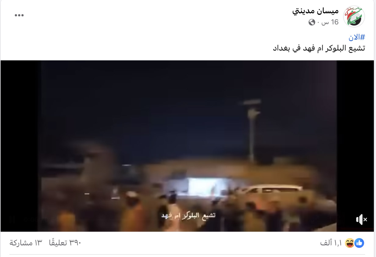 الوقائع: يظهر مجموعة من الأشخاص وهم يطلقون الرصاص بكثافة في الهواء، تكثف التشارك فيه مؤخراً، عبر مواقع التواصل الاجتماعي، وقد أُرفق بالمزاعم الآتية (من دون تدخل أو تصحيح): " #الان تشيع البلوكر ام فهد في بغداد"