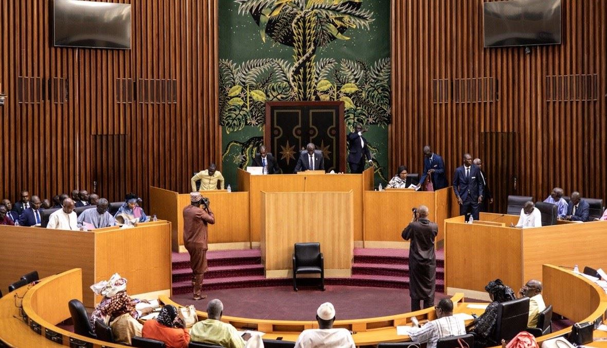 رئيس الجمعية الوطنية أمادو مامي ديوب (في الوسط) يفتتح جلسة مناقشة قانون العفو المقترح في دكار (6 آذار 2024، أ ف ب).