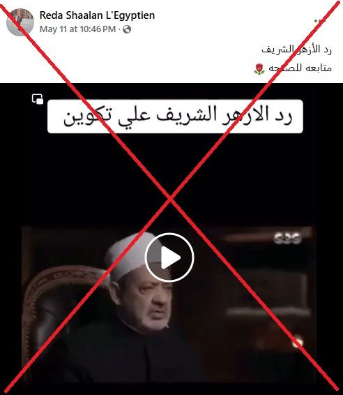 بيد أنه بالبحث عن المقطع، اتضح أن سياقه مختلف تماما ولا علاقة له بمركز تكوين، إذ يعود إلى 26 أيار (مايو) 2020، وجاء بعنوان: "الإمام الأكبر يكشف العواقب السلبية التي نتجت من انتشار صفة الجدال وادعاء المعرفة في العقد الأخير".