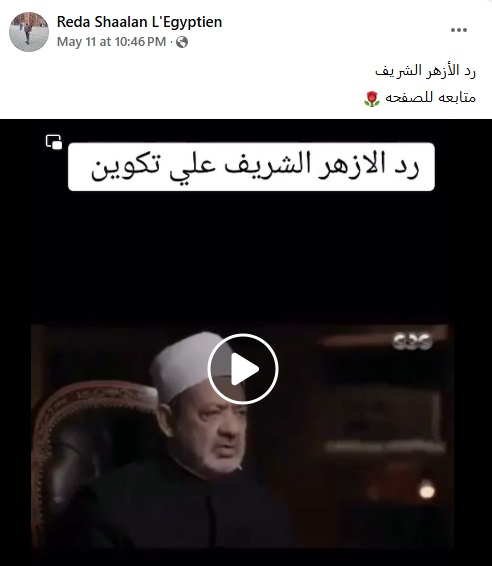 فقد تداولت حسابات على موقعي فايسبوك وإكس مقطع فيديو يتضمن حديثا للإمام الأكبر الدكتور أحمد الطيب شيخ الأزهر الشريف، وارفق بتعليق (من دون تدخل): "رد شيخ الأزهر على مركز تكوين"