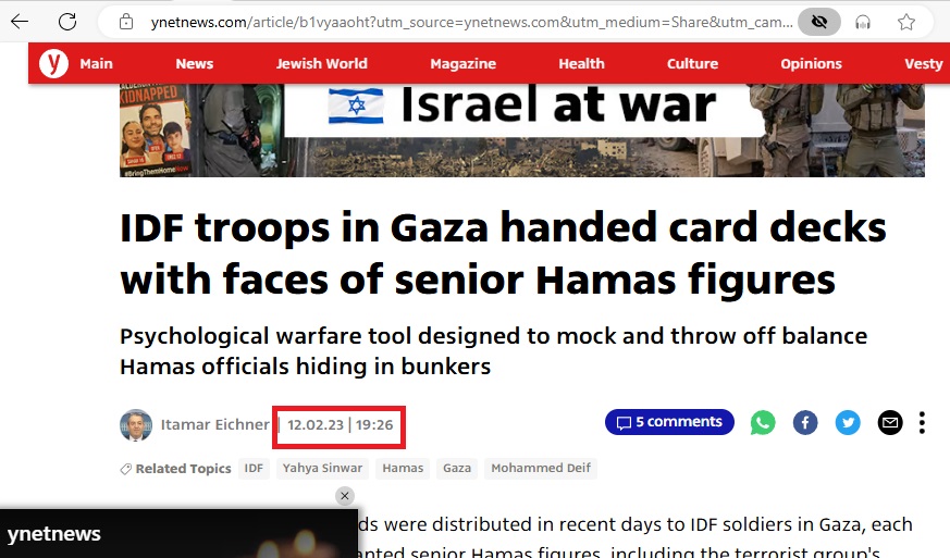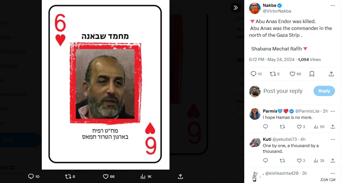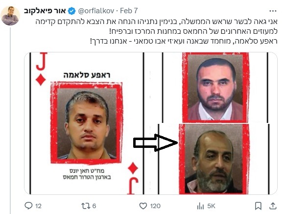 المفارقة أن ذات الصورة تداولتها حسابات إسرائيلية على (إكس) في 7 شباط (فبراير) 2024، وزعمت أيضاً أنها للقيادي الفلسطيني المطلوب تصفيته.
