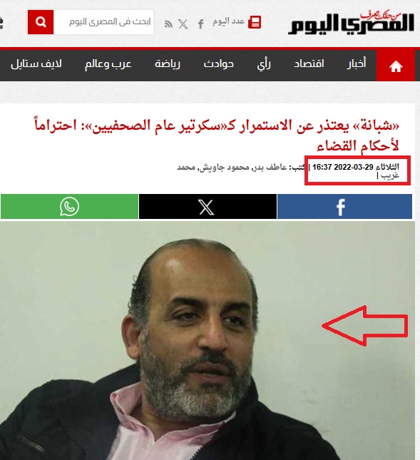 ويبدو أن القائمين على هذا الجهاز الأمني، بحثوا عن صورة للقيادي الفلسطيني على شبكة الإنترنت وتوصلوا لصورة الناقد الرياضي التي جاءت في حوار مع صحيفة "المصري اليوم" المصرية (هنا)، بتاريخ 29 أذار (مارس) 2022، والذي كان يتحدث فيه عن الاعتذار عن منصبه بنقابة الصحافيين حينذاك.
