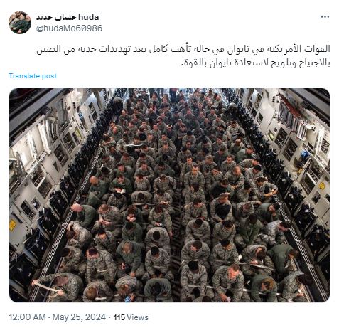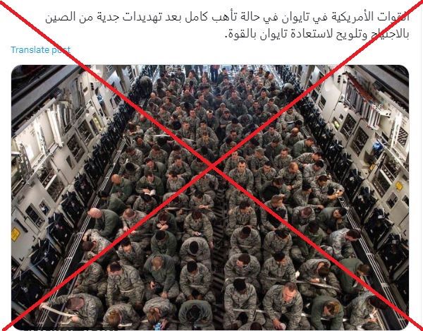 الصورة تظهر عسكريين جلسوا جنبا الى جنب في طائرة عسكرية، على ما يبدو. وقد تكثف التشارك فيها أخيرا عبر حسابات، عربية وأجنبية، ارفقتها بالمزاعم الآتية (من دون تدخل): "القوات الأمريكية في تايوان في حالة تأهب كامل. حاصرت الصين تايوان وجميع جزرها في ما تسميه تدريبات "العقاب". من الواضح ان الصين تخطط لغزو قريب لتايوان".