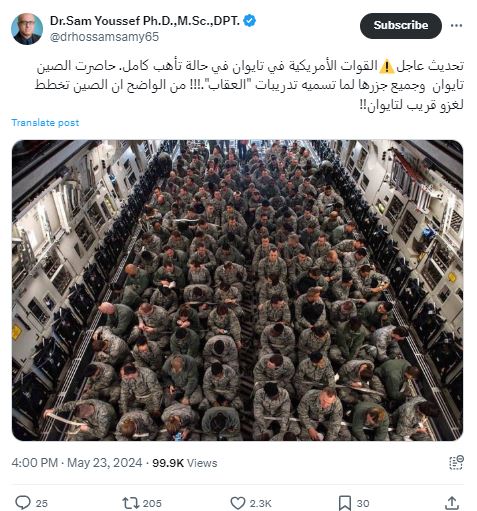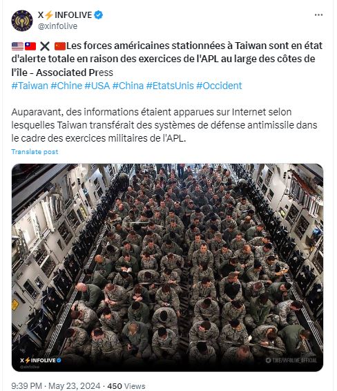 المتداول: صورة تظهر، وفقاً للمزاعم، "القوات الأميركية في تايوان في حالة تأهب كامل بعد تهديدات جدية من الصين باجتياح الجزيرة والتلويح باستعادتها بالقوة".