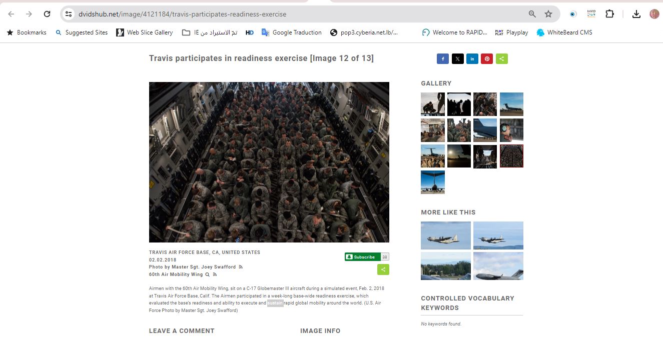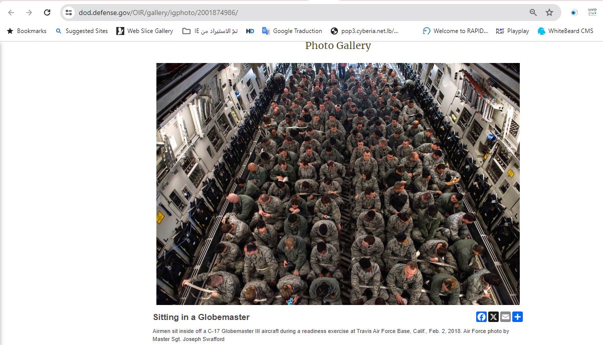 فالبحث العكسي عنها يوصلنا فورا الى موقع وزارة الدفاع الاميركية، الذي نشرها (هنا) مع شرح انها تظهر "طيارين يجلسون داخل طائرة من طراز سي-17 غلوب ماستر 3/ C-17 Globemaster III خلال تمرين على التأهب، في قاعدة ترافيس الجوية بكاليفورنيا، في 2 شباط 2018".