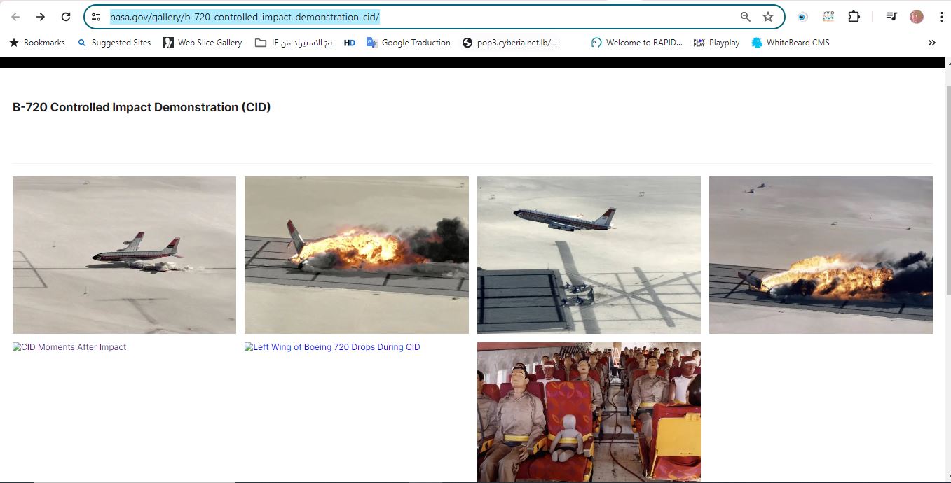 ونشاهد بوضوح هذه الدمى في الفيديو الذي نشره المركز، اضافة الى صور نشرتها وكالة ناسا للطائرة خلال ارتطامها وبعده. كذلك، عرض المركز فيديوين آخرين لاختبار الارتطام المتحكم به يومذاك، تم تصويرهما من زوايا مختلفة