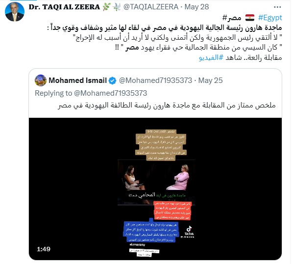 فعلى مدار أيام، تداولت حسابات موثقة على موقع التدوينات القصيرة إكس مقطع فيديو لرئيسة الطائفة اليهودية في مصر مع تعليق (من دون تدخل): "ماجدة هارون، رئيسة الجالية اليهودية في مصر، في لقاء لها مثير وشفاف وقوي جدا، لا التقي رئيس الجمهورية ولكن اتمنى ولكني لا اريد ان اسبب له الاحراج. كنت من نفس الحي؟ قالت لا فهو كان من ضمن الطبقة الاقل متوسطة من اليهود بينما هي كانت من وسط البلد من الطبقة الفوق متوسطة".
