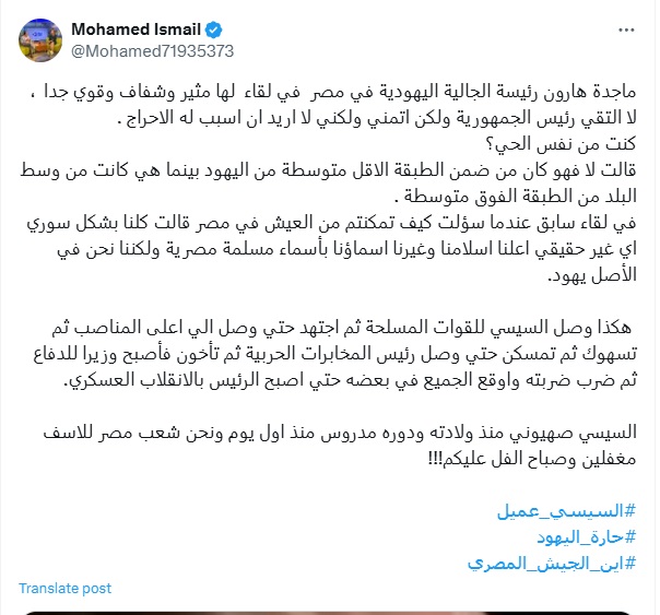 وتابعت التدوينة: "في لقاء سابق عندما سئلت كيف تمكنتم من العيش في مصر، قالت كلنا بشكل سوري اي غير حقيقي اعلنا اسلامنا وغيرنا اسماءنا بأسماء مسلمة مصرية، ولكننا نحن في الأصل يهود. هكذا وصل السيسي للقوات المسلحة، ثم اجتهد، حتى وصل الي اعلى المناصب، ثم تسهوك ثم تمسكن حتى وصل رئيس المخابرات الحربية، ثم تأخون فأصبح وزيرا للدفاع، ثم ضرب ضربته واوقع الجميع في بعضه حتى اصبح الرئيس بالانقلاب العسكري".