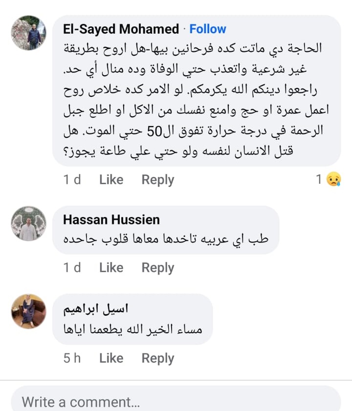 الخلاصة: "سيدة الحج" التي كانت تتوجه سيراً نحو جبل عرفات مصرية الجنسية وبصحة جيدة. كما أن سبب تحركها بمفردها هو تحرك الاتوبيس الذي كان يقلها ببطء شديد ولم تستطع الانتظار للوصول لأداء شعيرة الوقوف على عرفات.