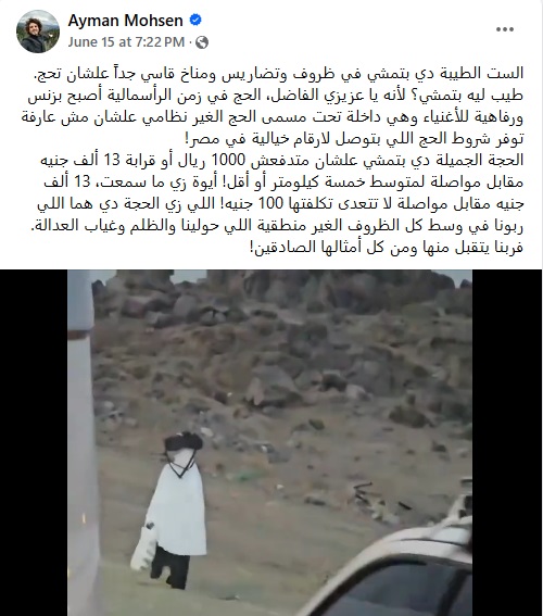 حسابات على موقع التواصل الاجتماعي الأشهر في مصر (فايسبوك) تداولت فيديو لسيدة مسنة تحمل على رأسها حقيبة وكانت تسير بمفردها نحو جبل عرفات وزعمت التعليقات أنها غير مصرية ولم تكمل الحج؛ وهو زعم غير صحيح تماما بعد التواصل معها ومع ذويها. FactCheck#"