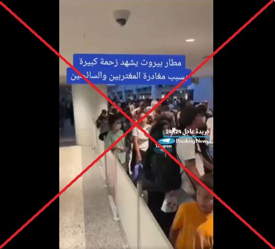 المشاهد تظهر صفوفاً طويلة لاشخاص ازدحموا في قاعة. وقد تكثف التشارك في الفيديو أخيرا عبر حسابات ارفقته بالمزاعم الآتية (من دون تدخل): "مطار بيروت يشهد ازدحاما غير مسبوق للمسافرين المغادرين للبنان"، وايضا "زحمة كبيرة في مطار بيروت هربا من الحرب المحتملة مع إسرائيل".