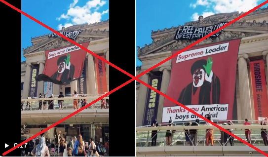 والفيديو الاصلي الذي تعود آثاره الى 1 حزيران 2024، يظهر بوضوح عدم رفع صورة لخامنئي خلال احتجاجات مؤيدة للفلسطينيين امام مبنى متحف بروكلين في نيويورك في 31 ايار 2024.