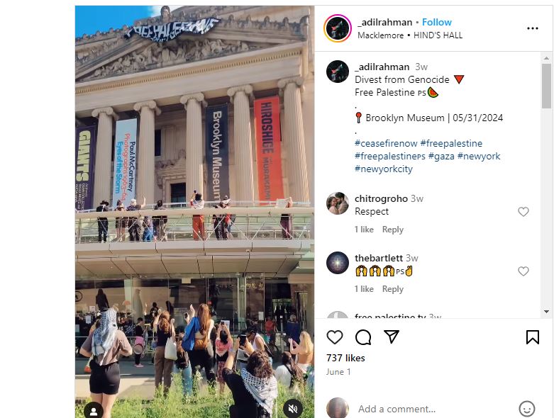 وحضت منظمة مؤيدة للفلسطينيين المتظاهرين على "الدخول بأعداد هائلة إلى متحف بروكلين من أجل غزة". وقالت إن النشطاء احتلوا المتحف لإجباره على الكشف عن أي استثمارات مرتبطة بإسرائيل وسحب أي تمويل من هذا القبيل.